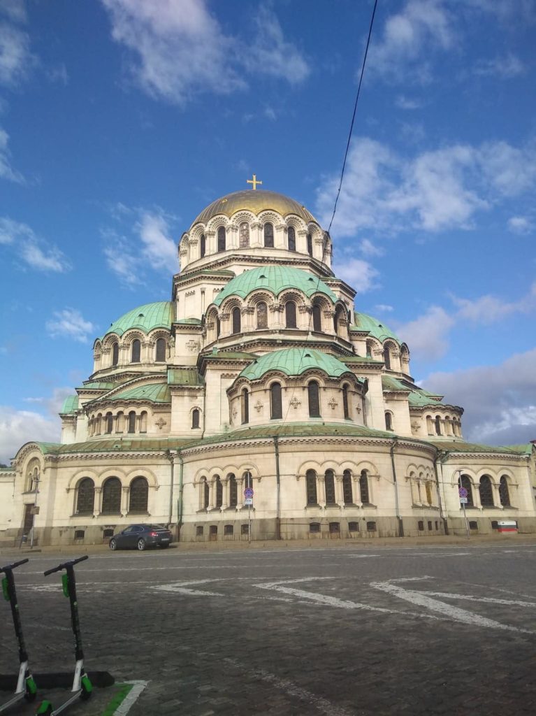 Voglio capire di più del contatto con i romani, ma l’ansia di vedere la Cattedrale di Aleksander Nevskij non riesco più a contenerla. Avete presente quando vi trovate di fronte l’immensità? Ecco, la sensazione è più o meno quella. C’è un’atmosfera di solennità che pervade tutta la piazza e si innalza fino al cielo, come se le cupole danzassero con le nuvole. Quando le opere dell’uomo non stuprano la natura, ma creano un’ osmosi con essa, scaturisce una manifestazione non descrivibile a parole. Simbolo di Sofia e di tutta la Bulgaria(secondo me anche di tutti i Balcani), la cattedrale è stata costruita tra il 1882 e il 1912 in memoria dei 200000 soldati russi morti sul campo durante la guerra russo-turca(1877-78) in nome dell’indipendenza bulgara. E’ intitolata a Aleksandr Jaroslavič Nevskij, eroe nazionale russo, famoso per le sue epiche gesta militari e principe di Novgorod nel XIII secolo. Realizzata con lo stile neobizantino caro alla Russia, gli interni sono possenti e ho avuto la fortuna di trovarmi durante una funzione. Visitando la Cattedrale rievocavo alla mente alcune canzoni dei Dead Can Dance, in sintonia con l’omelia del Pope. Ritornando verso il centro appare la visione di una chiesa simile al castello della Disney