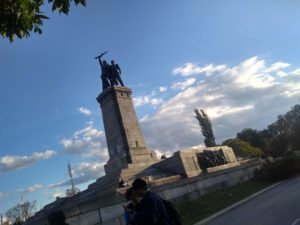 La strada tra il palazzo e mausoleo era la via usata dal partito per le parate ufficiali. Ci spostiamo verso l’Università di Sofia, una delle prime in Bulgaria. Qui Vasilli procede con una considerazioni positiva del periodo comunista in Bulgaria: l’istruzione era gratuita e il livello dell’analfabetismo si abbassò quasi del 100% e veniva data grande importanza alla salute e al fisico, un occhio particolare era dato allo sport, furono gli anni di atleti formidabili. Proseguiamo fino al Monumento all’armata rossa, segno di riconoscenza all’Armata Rossa per l’aiuto dato alla Bulgaria durante il secondo conflitto mondiale. Insieme a operai e soldati abbiamo la presenza di una donna lavoratrice, per la prima volta le donne bulgare accedevano al mondo del lavoro con lo stesso salario degli uomini. Il rilievo sul lato destro è stato, negli anni, oggetto di atti di vandalismo e atti dimostrativi. Immerso in un parco, oggi il monumento è totalmente ignorato dai ragazzi più giovani, infatti davanti ad esso i ragazzi si allenano con lo skate.